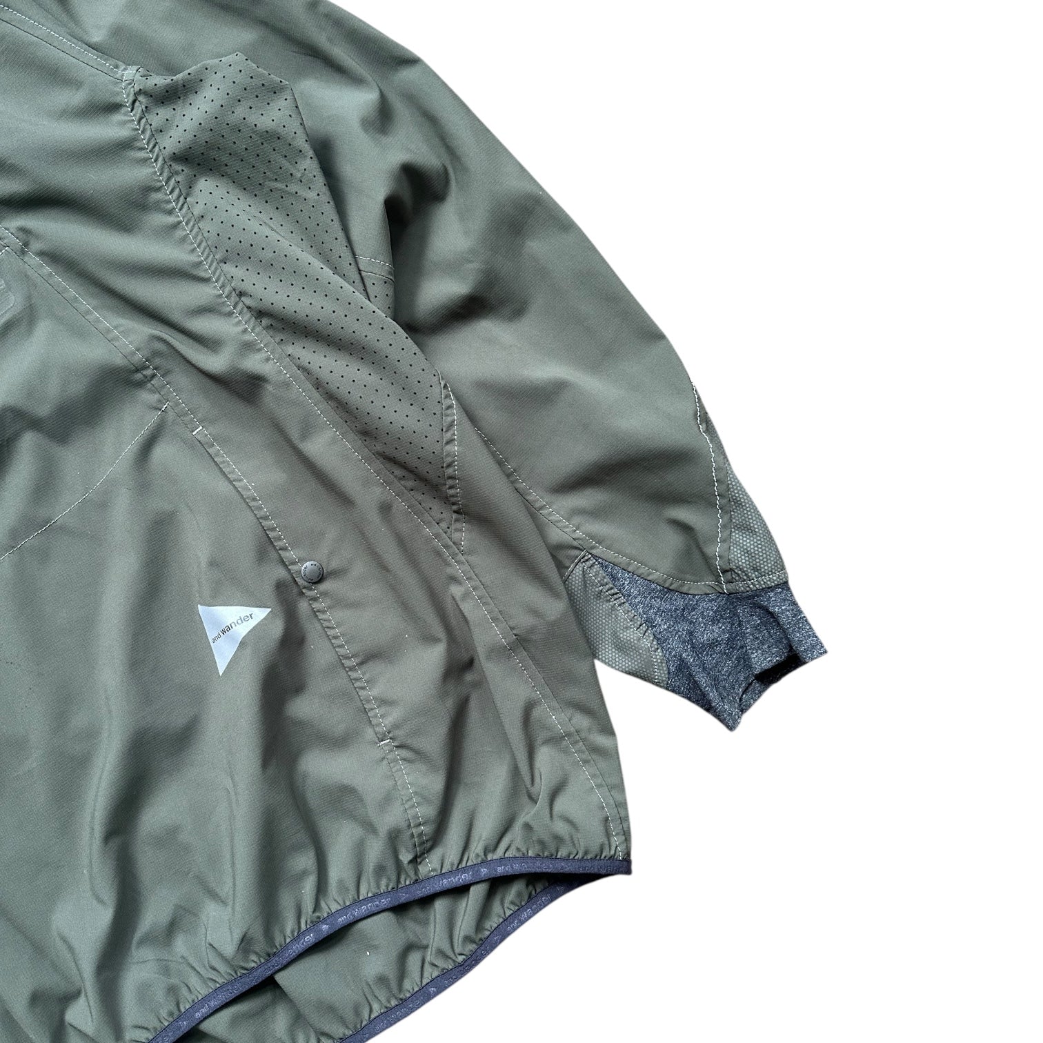 And Wander Khaki Green Pullover Smock Jacket. Lightweight, popper pullover in green with grey cuffs, And Wander reflective logo to stomach area and upper chest pocket. RRP £295